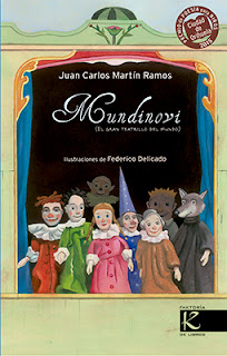 “Mundinovi” (El gran teatrillo del mundo) no es un libro de poesía al uso. Ante todo es un tributo a los títeres y titiriteros y a toda la magia que rodea ese espectáculo ancestral que continúa atrayéndonos, incluso en esta sociedad tan tecnológica. El subtítulo declara la intención del autor de equiparar el teatro con mayúsculas (alusión a la obra de Calderón: “El gran teatro del mundo”) y el teatro minúsculo (sólo en cuanto a tamaño) de los guiñoles. En cuanto al título, mantenemos la incógnita de su origen para que leáis el libro hasta el final, donde se aclaran algunas dudas sobre lo que nos podemos encontrar dentro de sus páginas.